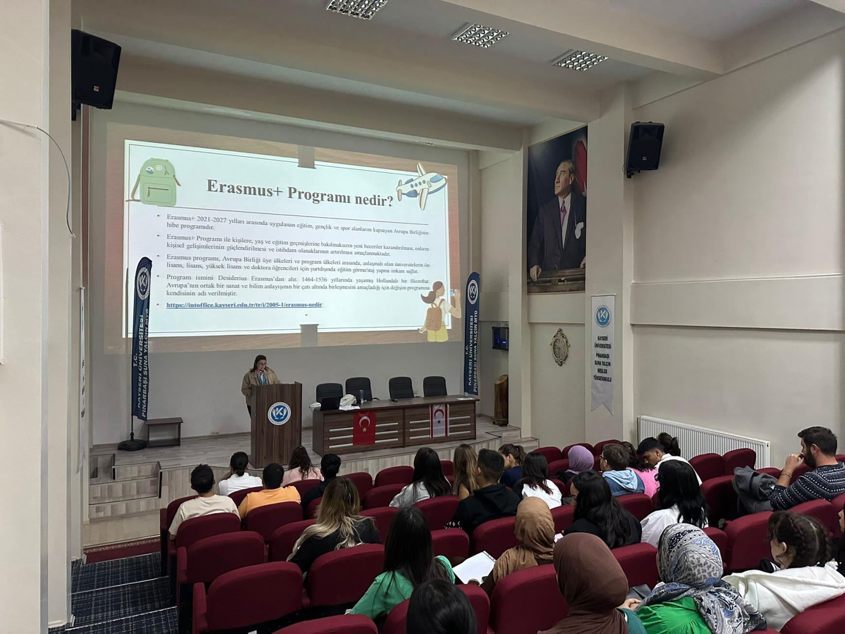 Erasmus+ Öğrenci Bilgilendirme Toplantısı ve Eurodesk Türkiye Temas Noktası Tanıtımı, Dış İlişkiler Ofis Başkanlığı Erasmus Uzmanı Öğr. Gör. Gözde ÇULFACI ve Eurodesk Türkiye Temas Noktası Temsilcisi Öğr. Gör. Mehmet KÖYLÜOĞLU'nun sunumları ve Pınarbaşı Meslek Yüksekokulu öğrencilerinin katılımıyla 6 Ekim 2025 Pazartesi günü saat 10.30'da Kayseri Üniversitesi Pınarbaşı Meslek Yüksekokulu Konferans Salonunda gerçekleştirilmiştir. Toplantıda, Erasmus+ öğrenci değişim programına katılmak isteyen öğrencilerimize süreç hakkında detaylı bilgiler verilerek soruları yanıtlanmış ve Eurodesk hakkında bilgilendirme yapılmıştır.