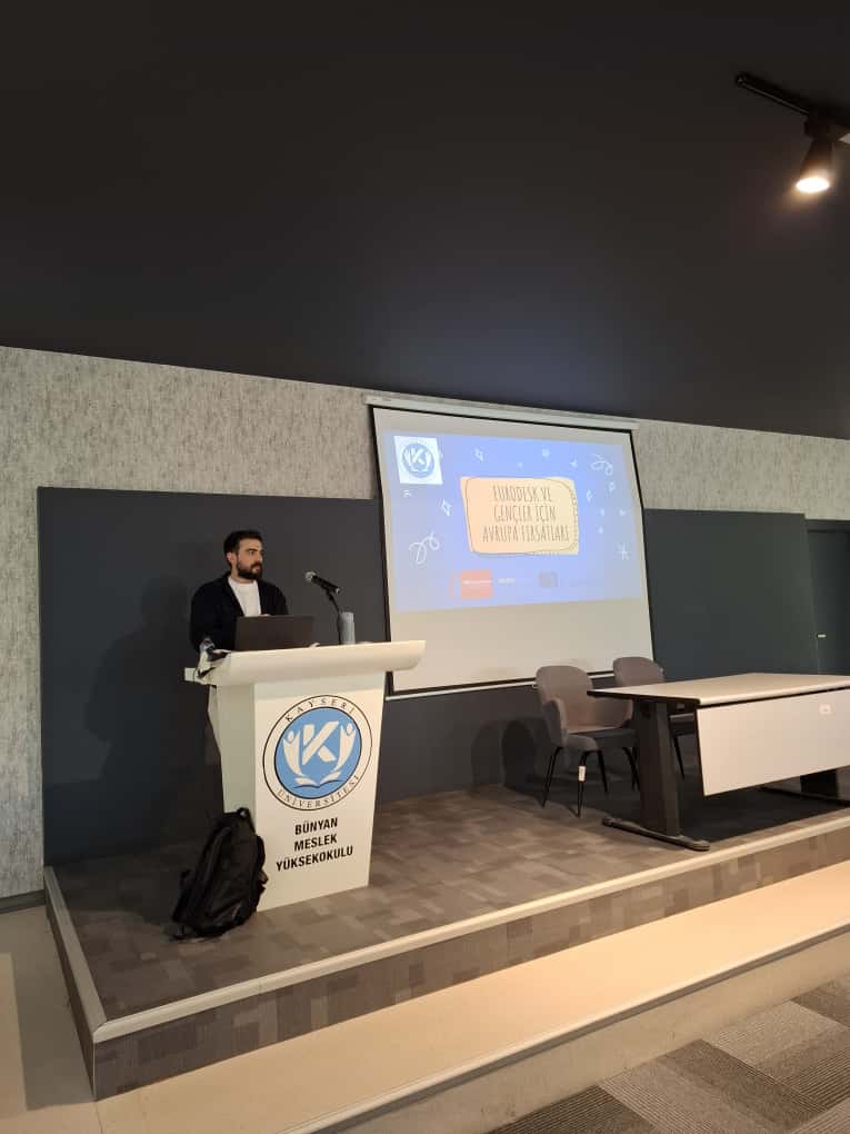 The Erasmus+ Student Information Meeting and Eurodesk Türkiye Contact Point Presentation were held at Kayseri University Bünyan Vocational School Conference Hall on Monday, October 6, 2025, at 4:00 p.m., with the participation of students from the vocational school. The event featured presentations by Erasmus Specialist Lect. Gözde Çulfacı from the Directorate of International Relations Office and Eurodesk Türkiye Contact Point Representative Lect. Mehmet Köylüoğlu. During the meeting, detailed information was provided to students interested in participating in the Erasmus+ student exchange program, their questions were answered, and an introduction to Eurodesk was also presented.