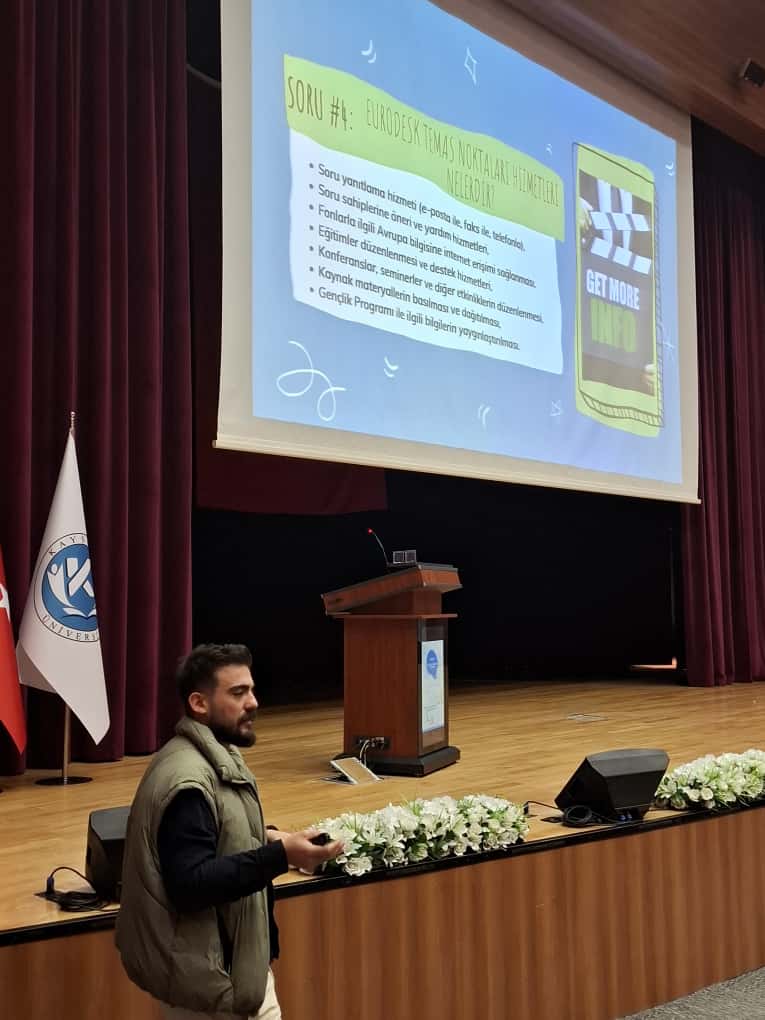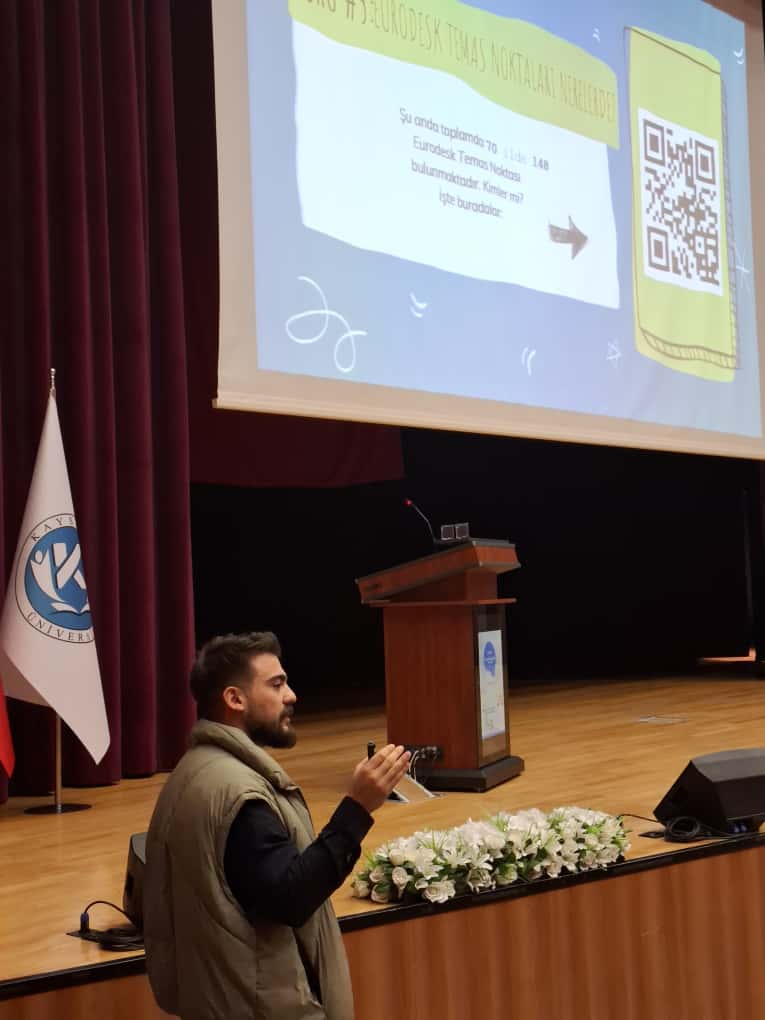 Erasmus+ Öğrenci Bilgilendirme Toplantısı ve Eurodesk Türkiye Temas Noktası Tanıtımı, Dış İlişkiler Ofis Başkanlığı Erasmus Uzmanı Öğr. Gör. Gözde ÇULFACI ve Eurodesk Türkiye Temas Noktası Temsilcisi Öğr. Gör. Mehmet KÖYLÜOĞLU'nun sunumları ve Bilişim Teknolojileri Meslek Yüksekokulu, Teknik Bilimler Meslek Yüksekokulu ve Lisansüstü Eğitim Enstitüsünde öğrencilerinin katılımıyla 17 Ekim 2025 Cuma günü saat 11.00'de Kayseri Üniversitesi 15 Temmuz Yerleşkesi Kongre ve Kültür Merkezinde gerçekleştirilmiştir. Toplantıda, Erasmus+ öğrenci değişim programına katılmak isteyen öğrencilerimize süreç hakkında detaylı bilgiler verilerek soruları yanıtlanmış ve Eurodesk hakkında bilgilendirme yapılmıştır.📝💬